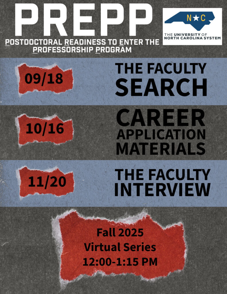The POSTDOC READINESS to ENTER the PROFESSORSHIP PROGRAM (PREPP) is a professional development initiative designed to equip postdoctoral scholars with the knowledge, skills, and insights necessary to successfully transition into faculty positions. Established and coordinated by the North Carolina State University Office of Postdoctoral Affairs, co-sponsored by UNC-CH and other System Schools, PREPP aims to provide targeted guidance on critical aspects of the faculty job search and career progression. Through a series of interactive panel discussions featuring faculty and administrators from UNC system institutions, PREPP offers practical strategies for navigating the academic job market, securing faculty positions, and effectively managing early-career faculty responsibilities. By leveraging expertise from across the UNC system, the program ensures that postdocs receive diverse perspectives and actionable advice on preparing for the professoriate.