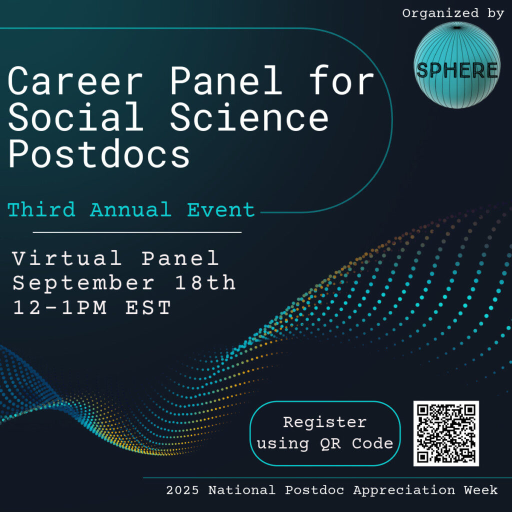 Details: Join SPHERE for their second annual social sciences career panel. An online panel of speakers from throughout the country will discuss career paths for postdocs in the social sciences. Speakers will share tips for getting the most out of your social science postdoc, reflect on how they navigated the job market, and explore their views of what skills social scientists need to be successful in the future.