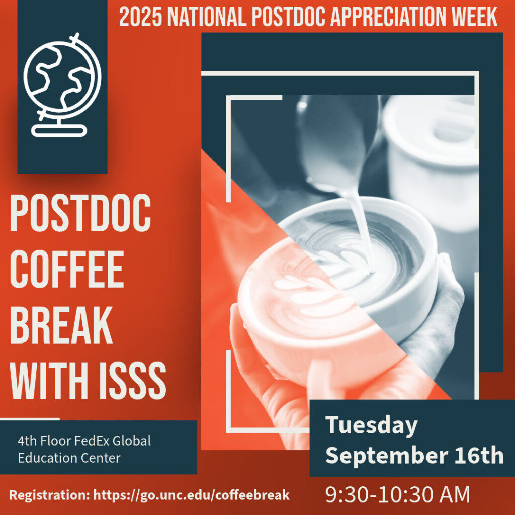 Details: Please join the BIPOC Postdoctoral Alliance for a coffee break to engage in meaningful conversations with faculty and staff across an array of departments and centers on UNC’s diverse campus. Enjoy refreshments, fresh air, and invaluable expertise from those who excel in their professions – prospective careers following your postdoctoral journey! Guests include leadership from the Office of Postdoctoral Affairs, researchers in the biomedical, public health, and mental health fields, representatives from the American Indian Center, Latinx Center, and the Center for Student Success. Take home Postdoc Appreciation gift bags!