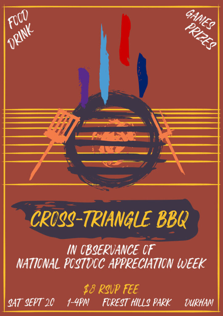 Details: All UNC postdocs are invited to attend a CROSS-CAMPUS SOCIAL from 3:30 – 6:00 pm on Sunday, 15th September. There will be plenty of FREE food, and family members are welcome to join! Following on from the success of last year’s Triangle Social, this event presents a unique opportunity to connect with postdocs across the Triangle area, with representation from North Carolina State University, Duke University, East Carolina University, North Carolina Central University, and the National Institute of Environmental Health Sciences (NIEHS). The event will take place at Ritter Park (Rotary Shelter), 301 W Lochmere Dr, Cary, NC 27518. To give us an idea of the numbers attending, and to facilitate ridesharing, we ask that you please register for the event in advance. We look forward to seeing everyone for BBQ, Pizza, and lots of fun!! Please note: Vegetarian options will be provided, and there will be a shelter to protect from sun exposure and bad weather.