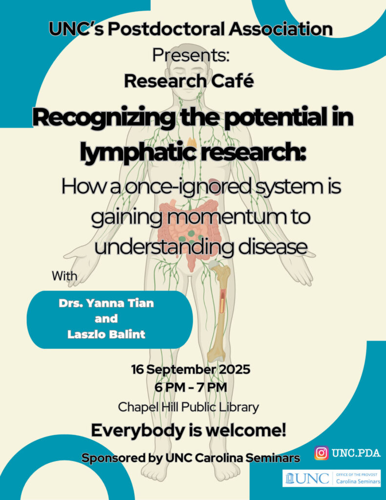 Lymphatic vessels run parallel with blood vessels in our body and are critical for maintaining our health. For centuries, the lymphatic system has been overlooked and understudied. Yet, lymphatic diseases, such as lymphedema, affect hundreds of millions of people worldwide without effective treatment options. In this talk, Drs. Yanna Tian and Laszlo Balint provide insight into the most recent discoveries in lymphatic research and how a better understanding of the lymphatic vasculature may propel the development of groundbreaking novel therapies. Join us on Tuesday, September 16th, from 6:00 to 7:00 PM at the Chapel Hill Public Library.