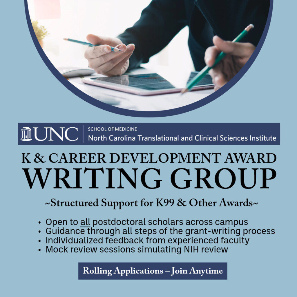 The NC TraCS K and Career Development Award (CDA) Writing Group welcomes postdoctoral scholars preparing K99 applications, other K mechanisms (K01, K08, K23), or CDA submissions, including resubmissions. Open to all postdocs and disciplines across campus, the group provides structured guidance on each component of the application, individualized feedback from experienced faculty, and mock review sessions. The group meets weekly throughout the year. You can find more information on the NC TraCS website here.