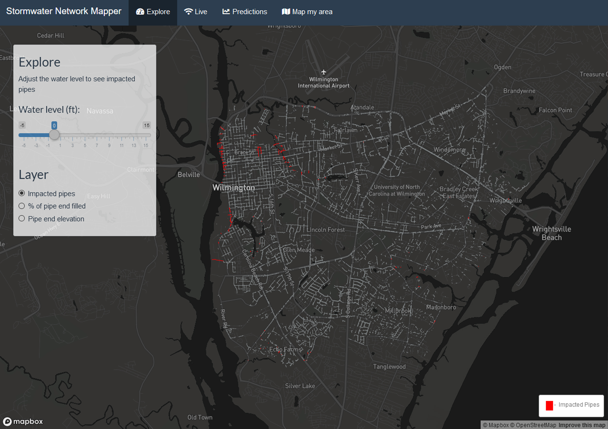 As part of this work, Piehler’s PhD student Adam Gold has created a stormwater network mapper for Wilmington, North Carolina, that shows all the storm water pipes for the area, highlighting the ones that no longer function.