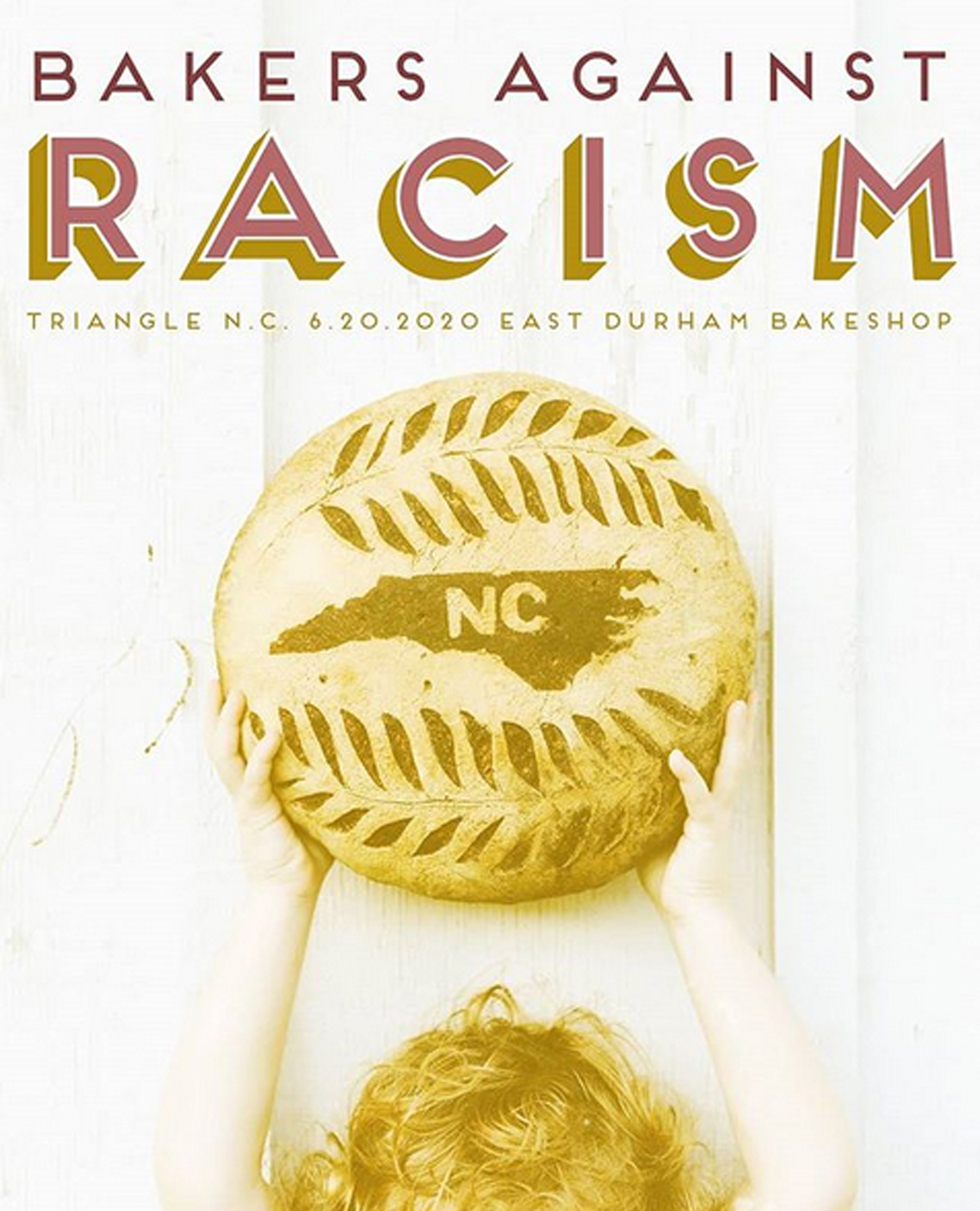 a photo of a small child grabbbing a loaf of bread dusted in a design of the state of NC; top reads "Bakers Against Racism, Triangle N.C., 6.20.2020, East Durham Bakeshop"