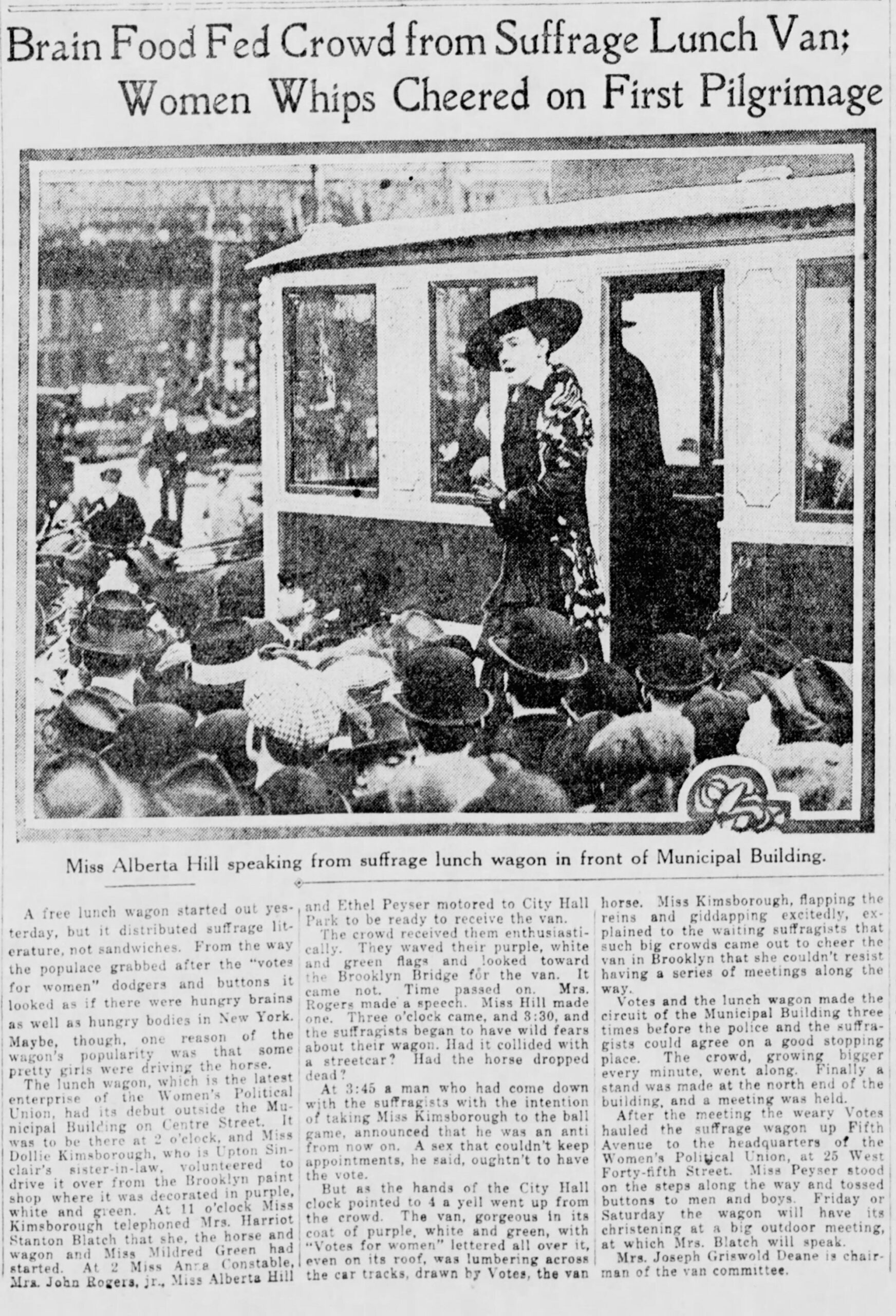 a 1915 newspaper clipping of a story called "Brain Food Fed Crowd from Suffrage Lunch Van; Women Whips Cheered on First Pilgrimage"