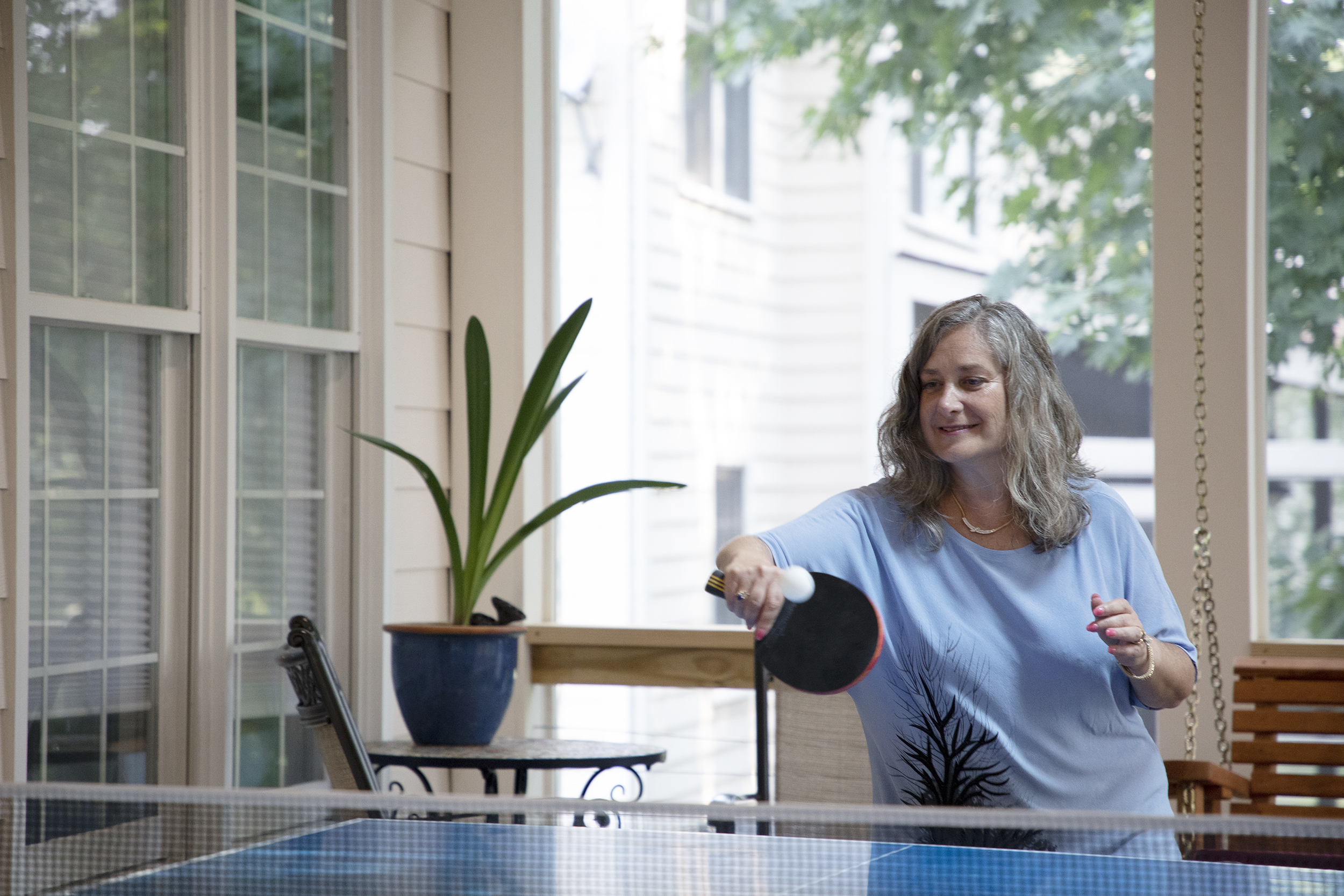 A snap sounds, and Eric leans over the Carolina blue Ping-Pong table, extending his arm as far as possible to smack the ball back toward his wife, Jen, who laughs. The girls launch into a story about how their parents met in college and, after moving in together in graduate school, the only surface in their house was a Ping-Pong table, which they would cover with a tablecloth for meals.